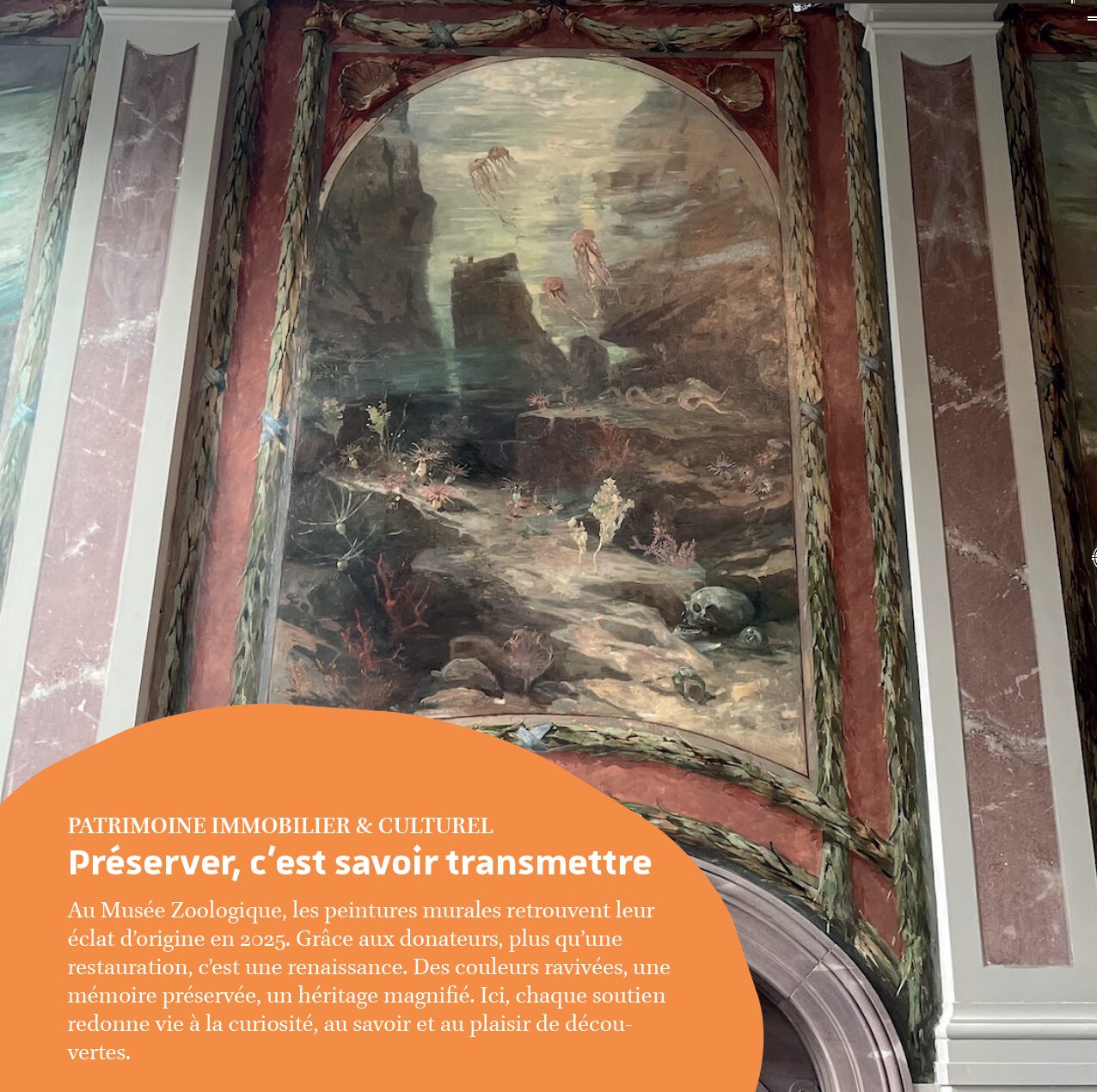Grâce à la mobilisation de donateurs à hauteur de 18 000 €, la fresque historique du Musée zoologique, réalisée en 1893 par le peintre allemand Georges Hacker, a récemment pu être restaurée. Fragilisée par le temps, l’œuvre a fait l’objet d’un travail minutieux de nettoyage et de consolidation, permettant aujourd’hui aux visiteurs de redécouvrir ce panorama du monde vivant dans toute sa richesse.